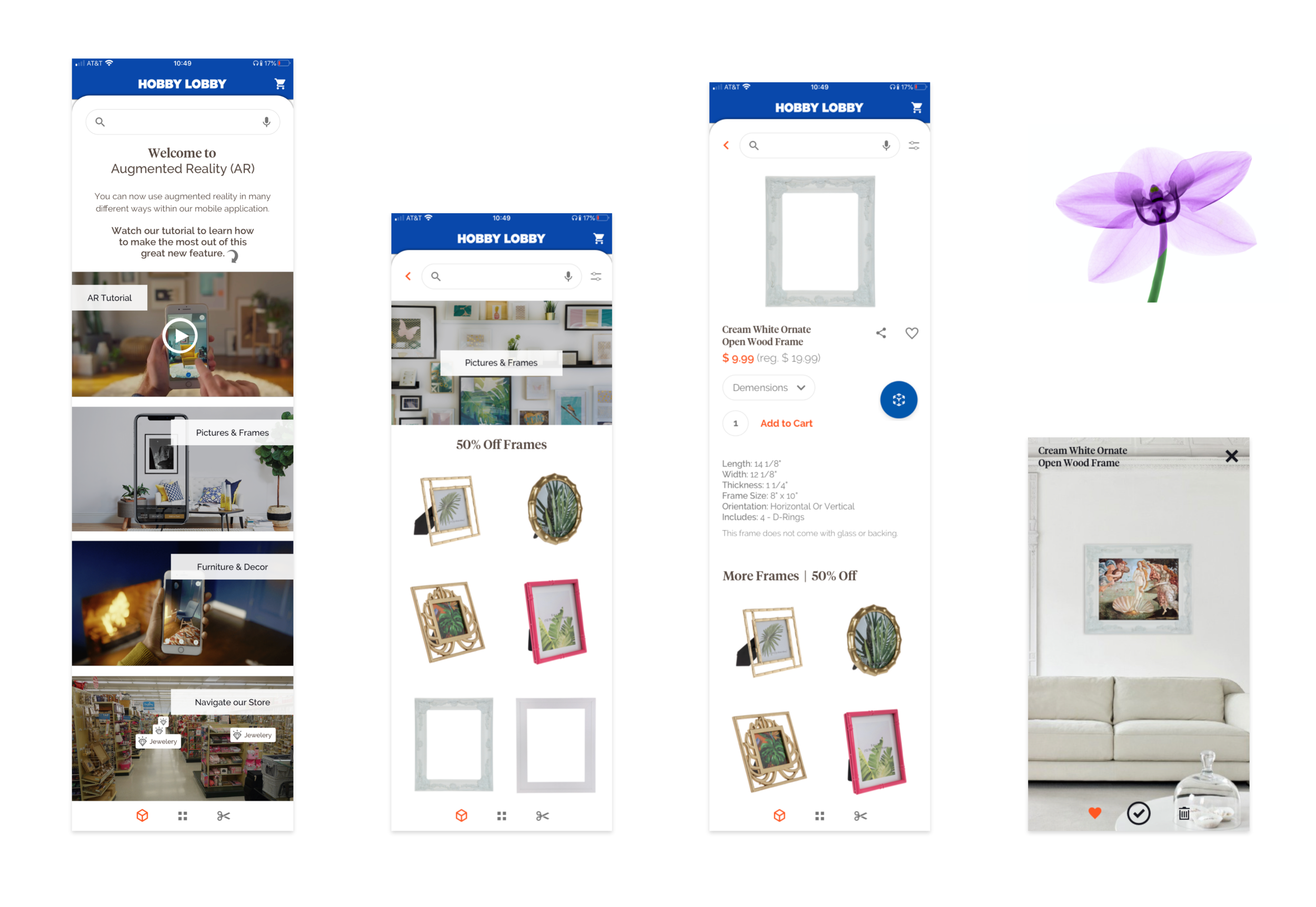 I also introduced voice commands. Hobby Lobby has a huge catalog of products and by being able to use your voice to search for a specific item, we cut down the search time dramatically. I also envisioned an Augmented Reality feature that user would use to be able to see picture frames and art work, large furniture and decor items in their home before committing to the purchase. My favorite part about it though is that it helps you navigate through the store and makes it easier for you to find what you are looking for. It would have saved me many hours of time during my college days.
