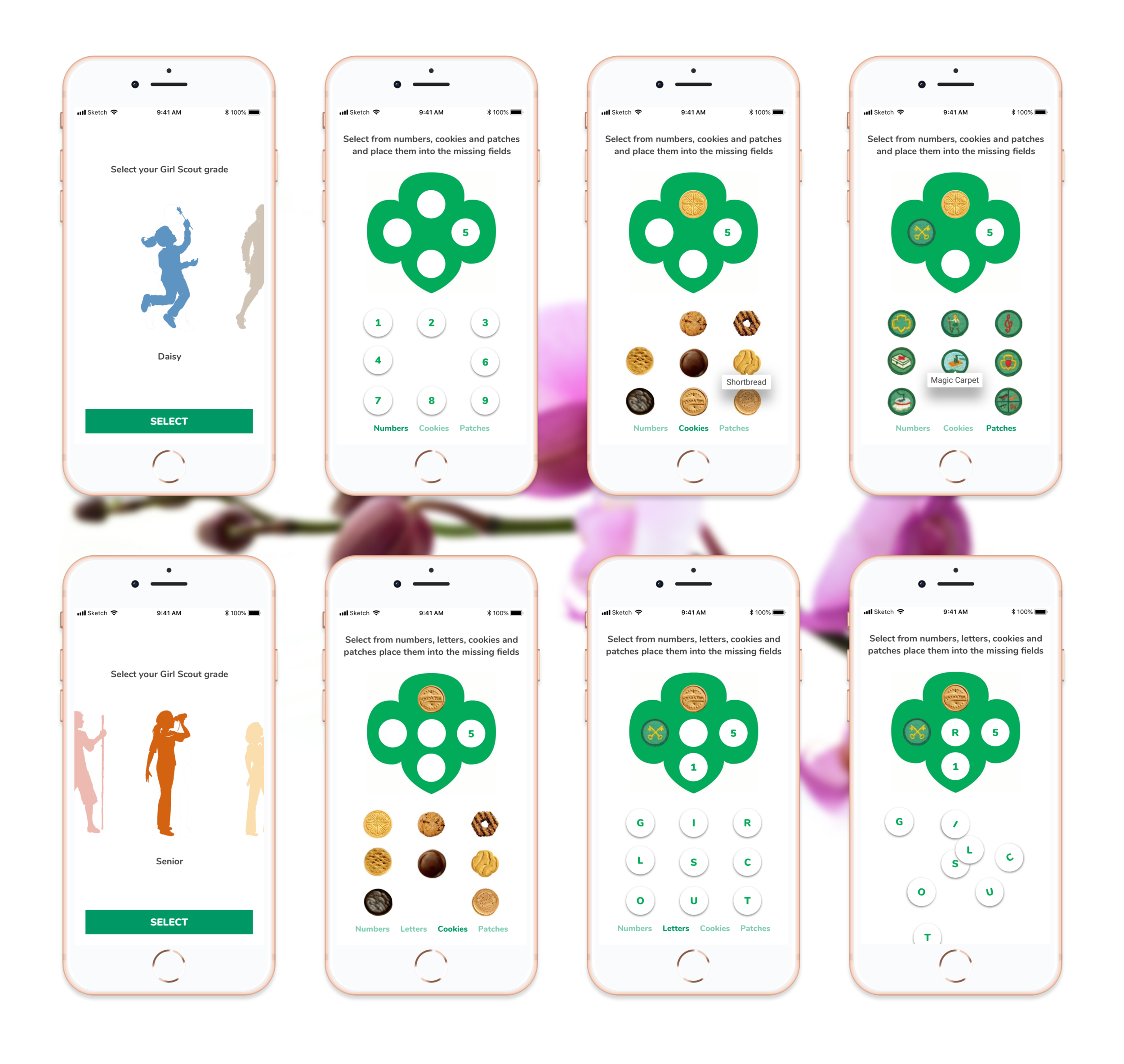 The idea was to create a more visual password for younger girls, as it is related to the Girl Scouts, which is fun to create and also easy to remember. I took the Girl Scouts logo as a basis and then a combination of Girl Scouts cookies and Patches with numbers a letters. On hard press of the cookie and the patches, you will also get the name for each, which also helps with memorizing your password.